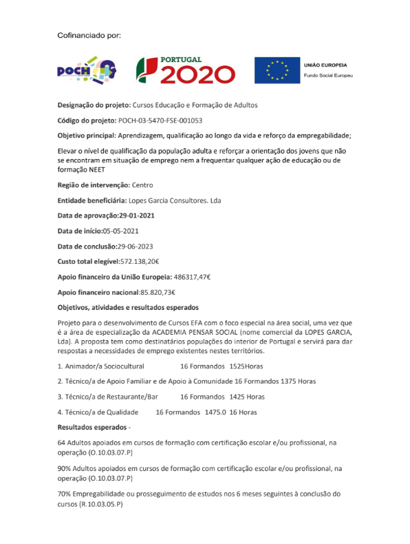 O presente projeto enquadra-se no AVISO POCH-70-2019-13 – Cursos de Educação e Formação de Adultos e está direcionado para o desenvolvimento de cursos EFA Pro nas áreas: 341 – Enquadramento na Organização; 762- Trabalho Social e Orientação e 811 – Hotelaria e Restauração, envolvendo desempregados em percursos EFA – componente tecnológica, integrados no CNQ, com vista à obtenção de qualificações de Nível 4.
